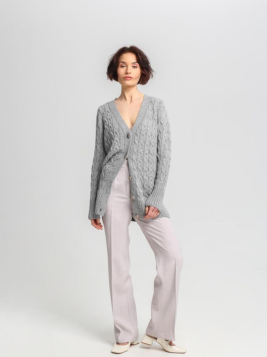 Długi kardigan z herbowymi guzikami oraz warkoczowym splotem.