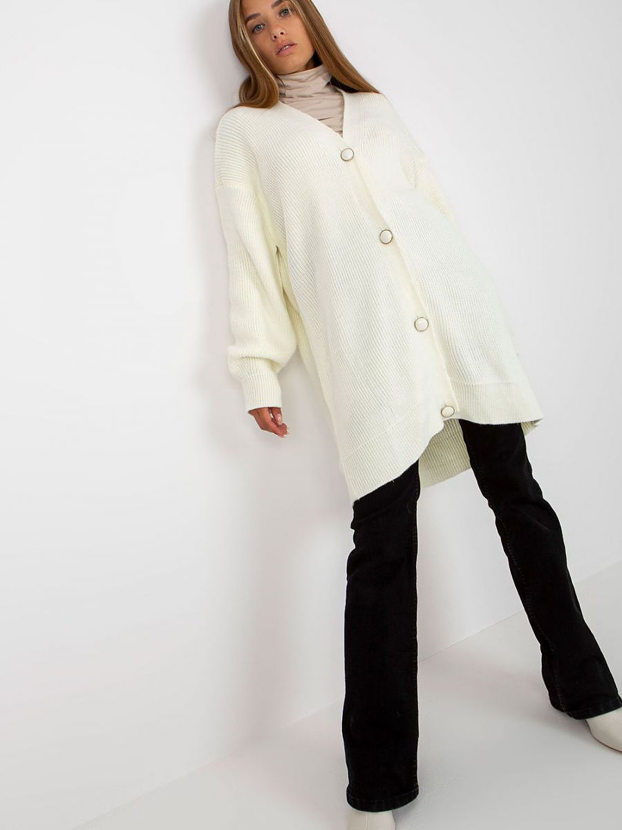 Kardigan o przedłużanym kroju, zapinany na guziki oraz długim rękawem.