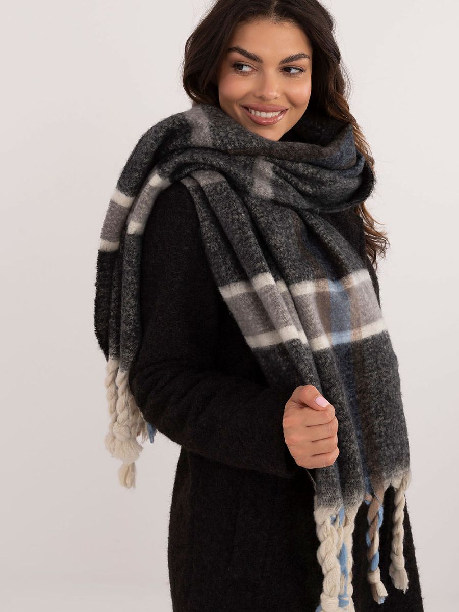Elegancki szalik o długości 180 cm z poliestru we wzór kratki, idealny na chłodniejsze dni. Wykonany z wysokiej jakości materiału, zapewnia ciepło i komfort. Ozdobne frędzle dodają mu modnego, stylowego akcentu, który wzbogaca każdą zimową stylizację. Ten uniwersalny szalik łączy funkcjonalność z elegancją, sprawiając, że będzie doskonałym dodatkiem do wielu różnych outfitów.