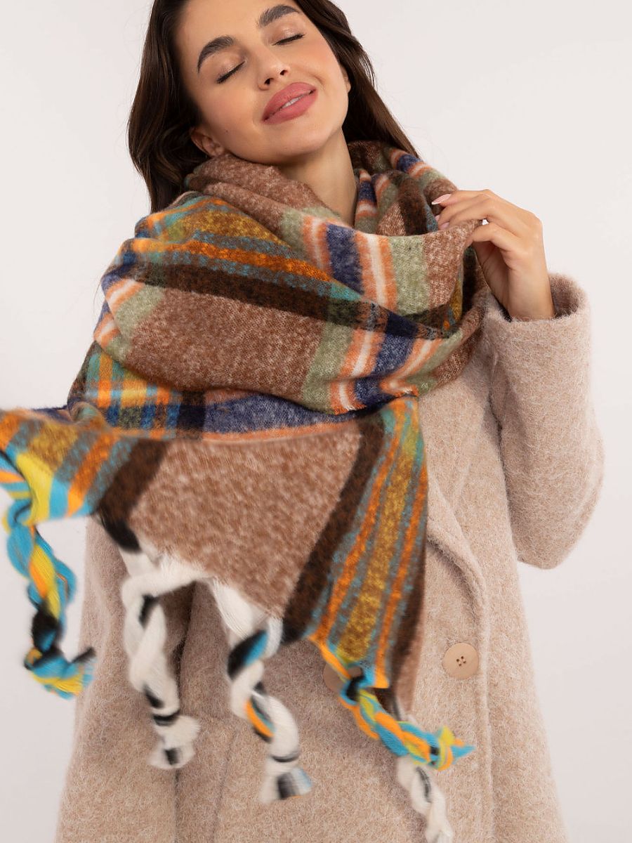 Elegancki szalik o długości 182 cm z poliestru we wzór kratki, idealny na chłodniejsze dni. Wykonany z wysokiej jakości materiału, zapewnia ciepło i komfort. Ozdobne frędzle dodają mu modnego, stylowego akcentu, który wzbogaca każdą zimową stylizację. Ten uniwersalny szalik łączy funkcjonalność z elegancją, sprawiając, że będzie doskonałym dodatkiem do wielu różnych outfitów.