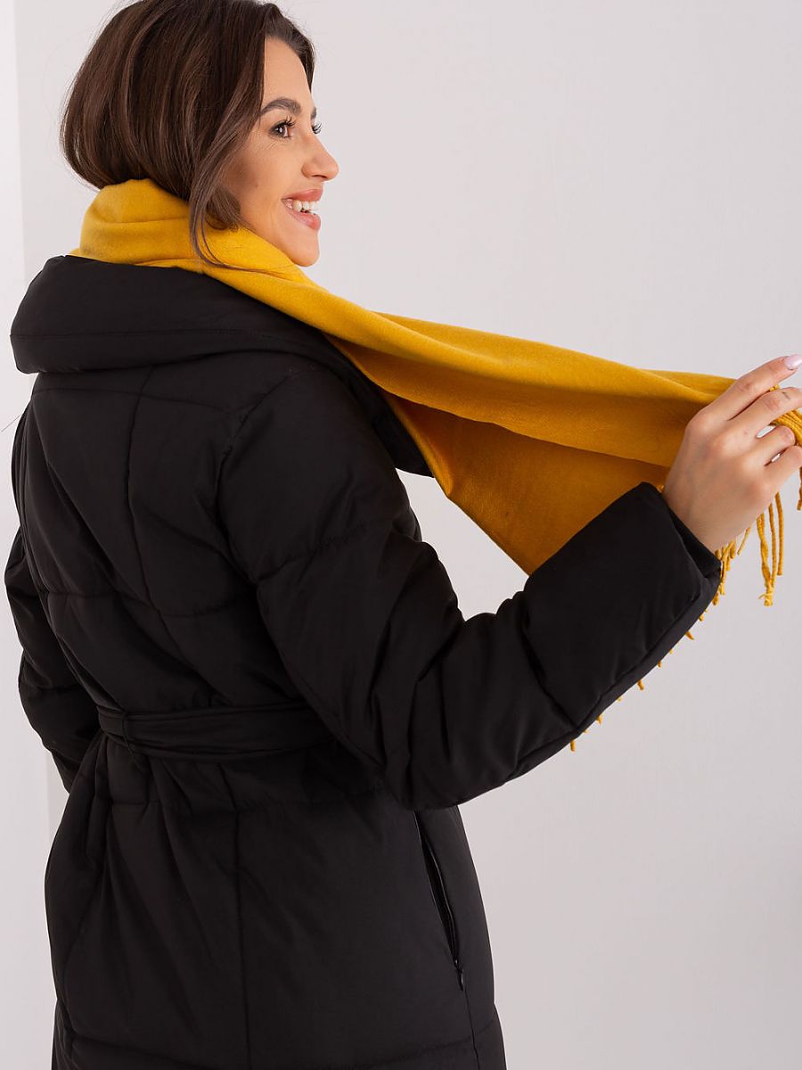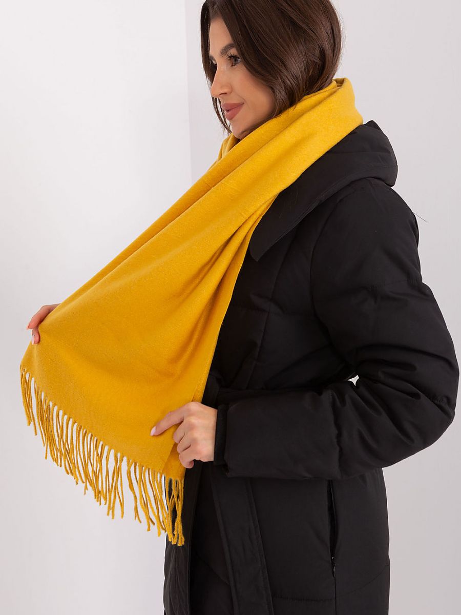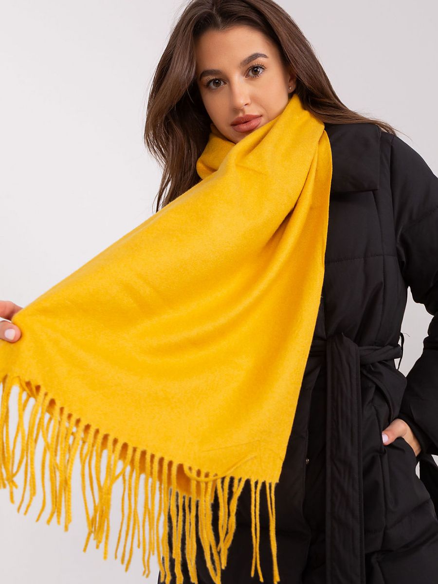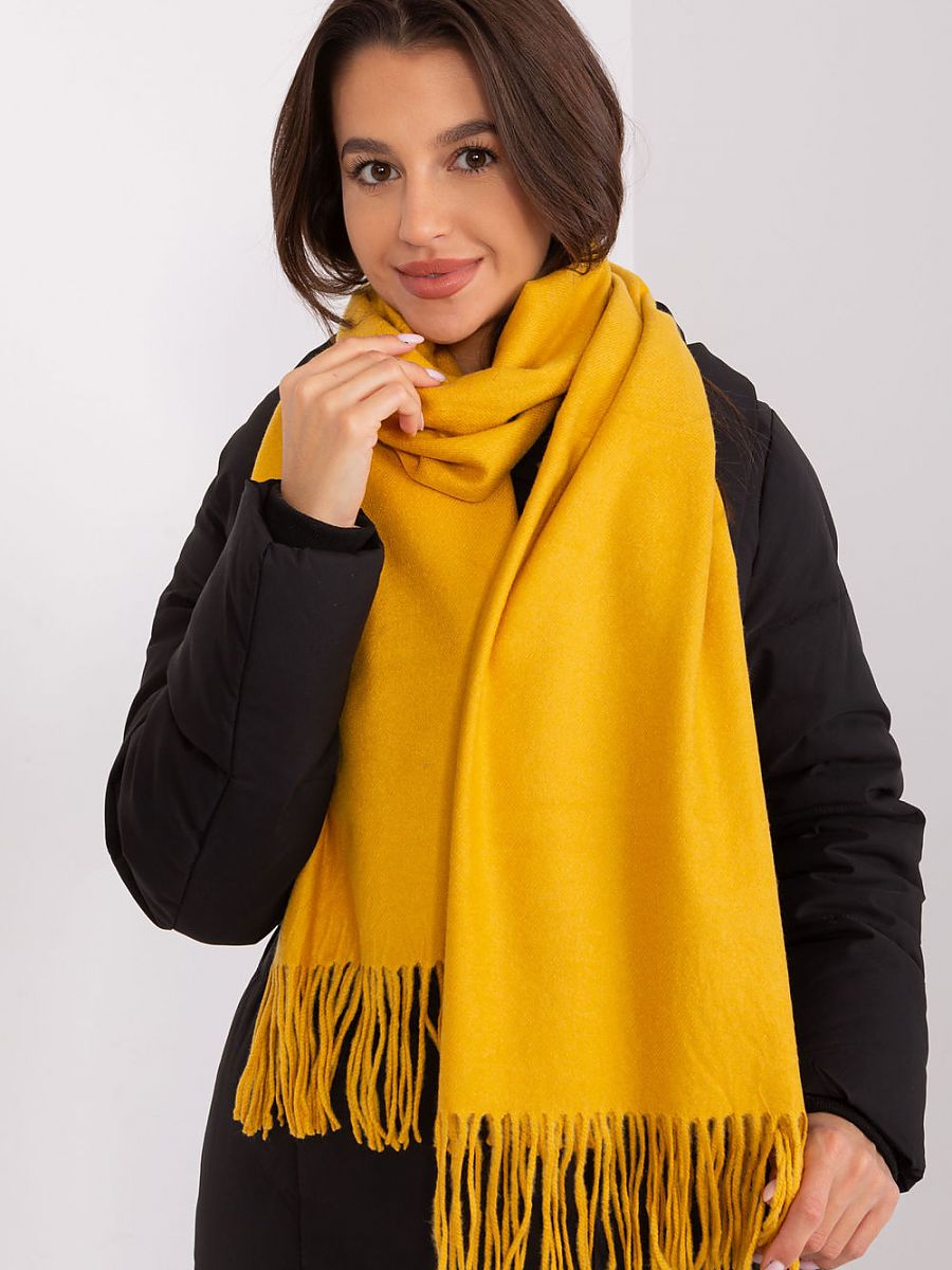 Ciepły długi szalik z ozdobnymi frędzlami, idealna propozycja na zimę.