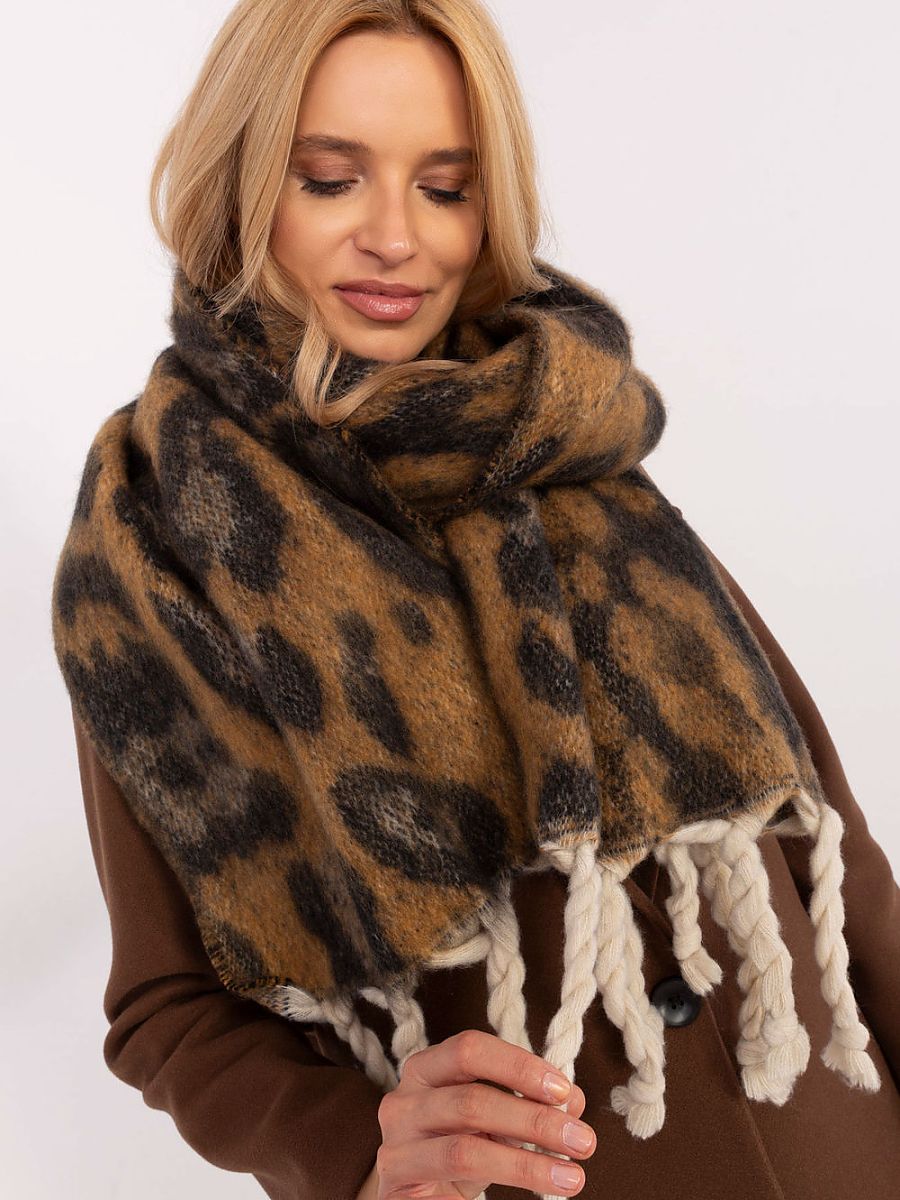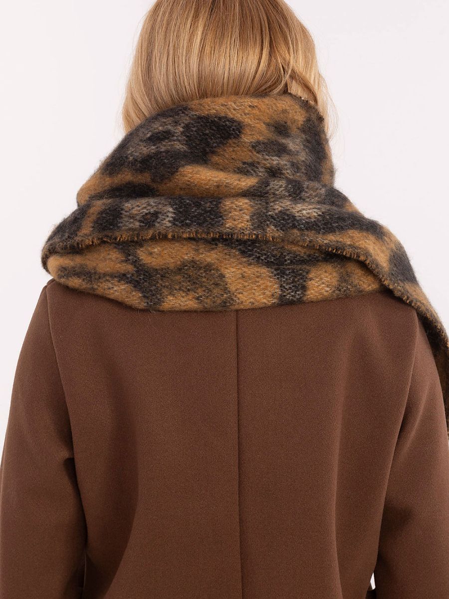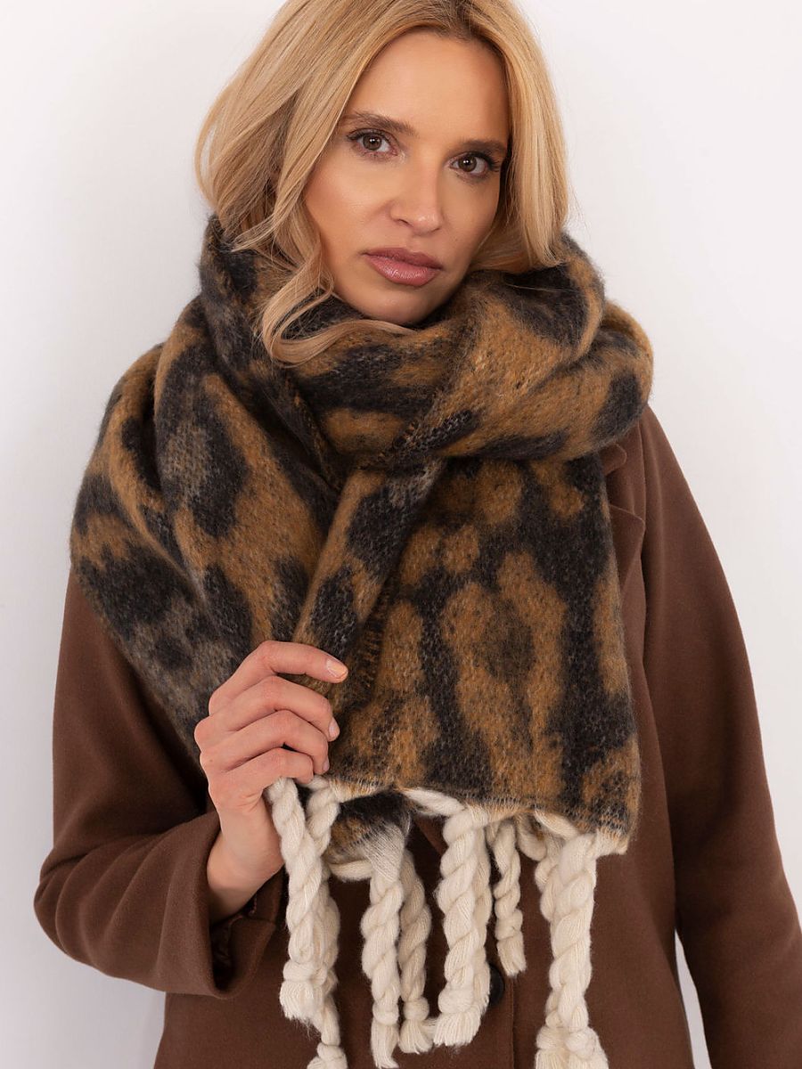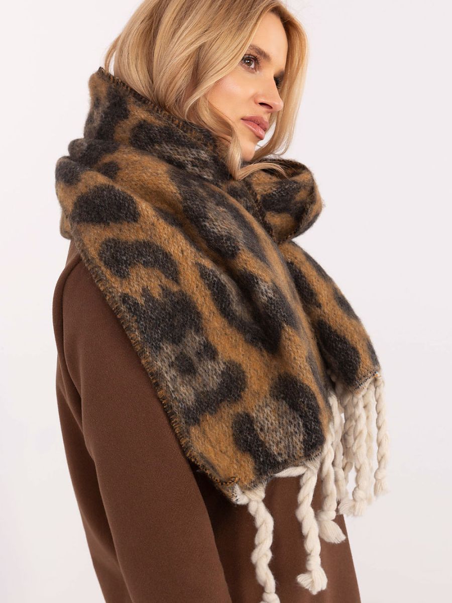 Elegancki szalik o długości 214 cm z poliestru z motywem zwierzęcym, idealny na chłodniejsze dni. Wykonany z wysokiej jakości materiału, zapewnia ciepło i komfort. Ozdobne frędzle dodają mu modnego, stylowego akcentu, który wzbogaca każdą zimową stylizację. Ten uniwersalny szalik łączy funkcjonalność z elegancją, sprawiając, że będzie doskonałym dodatkiem do wielu różnych outfitów.