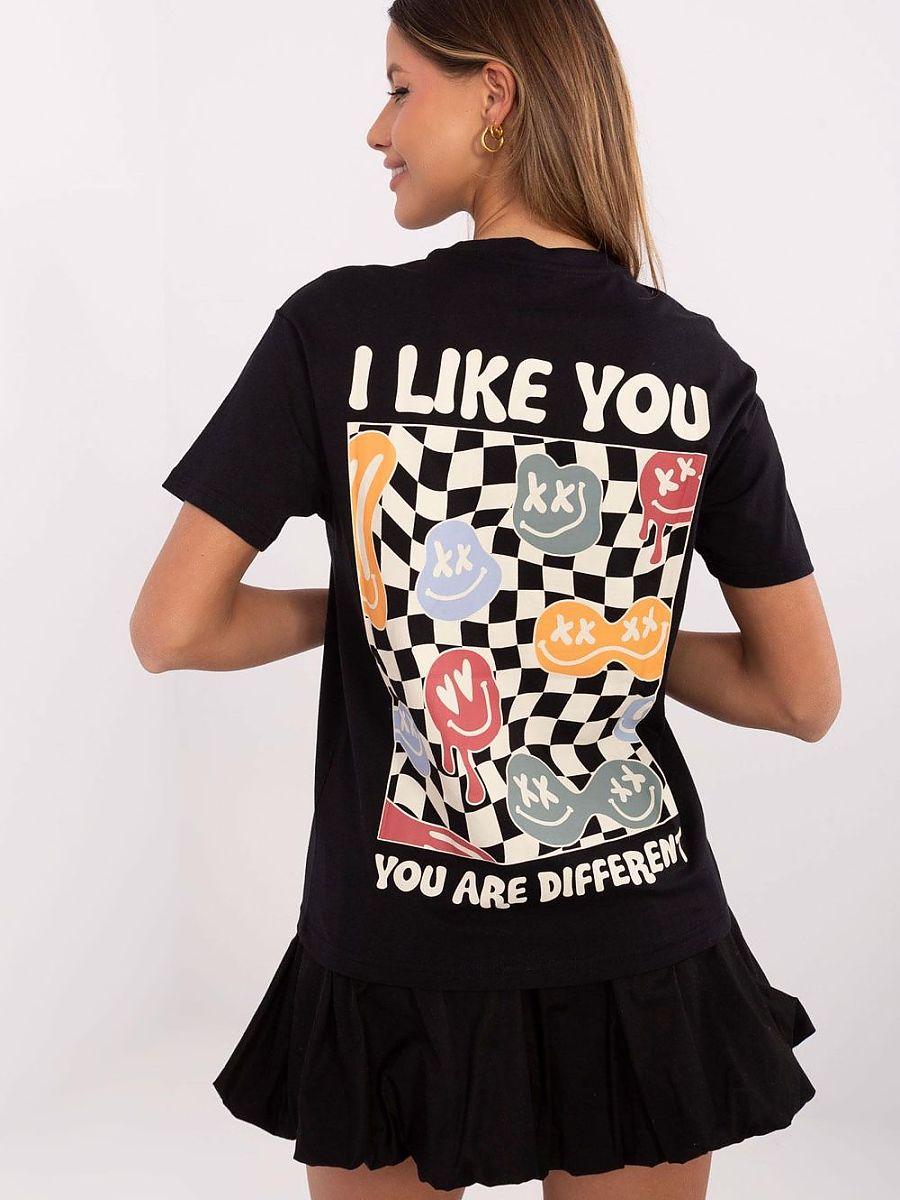 Damski t-shirt o klasycznym kroju, wykonany z wysokiej jakości bawełny, zapewniającej komfort noszenia. Przód zdobi subtelny nadruk z napisem, nadający koszulce modnego, minimalistycznego charakteru. Tył wyróżnia ozdobny nadruk połączony z dynamicznymi napisami, które dodają całości oryginalnego wyrazu. Model o standardowej długości, z krótkimi rękawami i okrągłym dekoltem, doskonale sprawdzi się w codziennych stylizacjach. Idealny wybór dla kobiet ceniących wygodę i styl w jednym.
