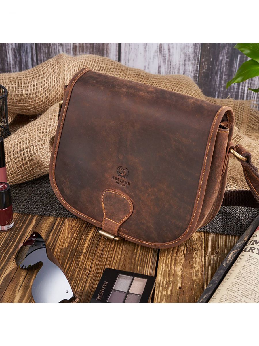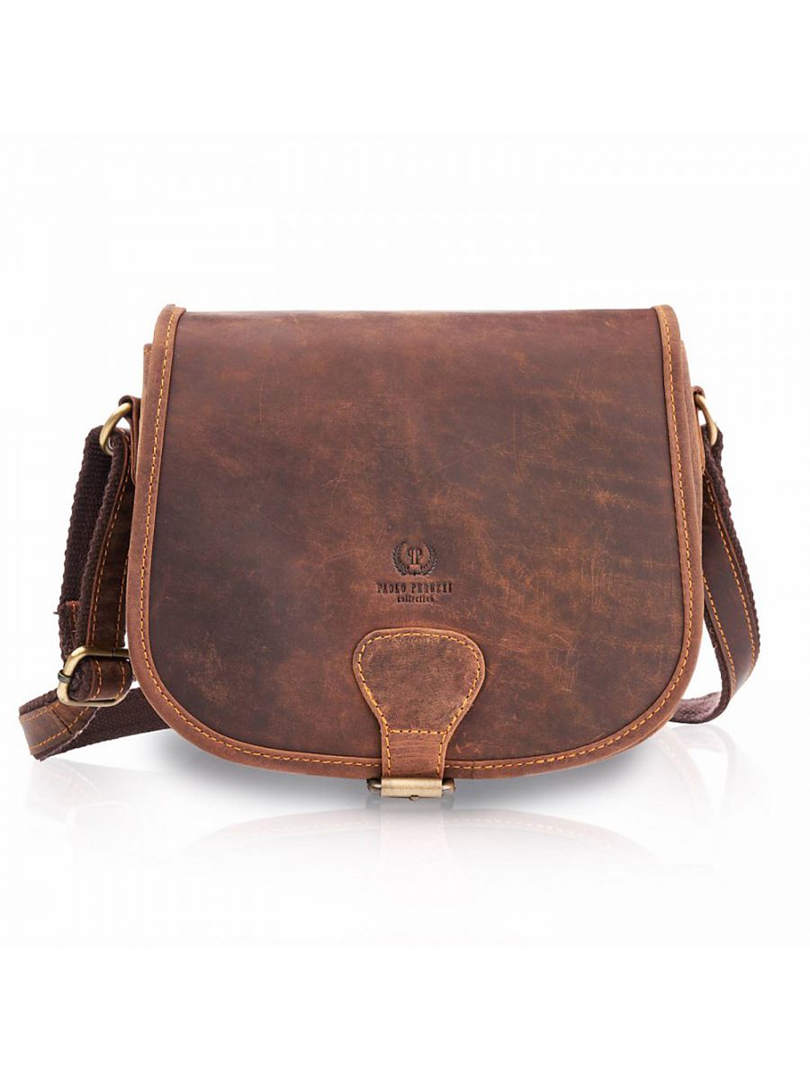 Model T-39-BR to mała i poręczna torebka damska wykonana ze skóry naturalnej w stylu vintage. Ta klasyczna propozycja dodatku galanteryjnego świetnie sprawdzi się zarówno w zimowych, jak i również wiosenno-letnich stylizacjach. Torebka jest zapinana skórzanym paskiem na magnes, zakończonym ozdobną metalową sprzączką w kolorze przecieranego złota. Pod klapą umieszczono mniejszą kieszeń wsuwkę. Główna komora, wykończona połyskującą podszewką, posiada kieszeń na suwak oraz przegródkę na telefon. Na tyle torebki znajduje się kolejna kieszeń na suwak. Solidny skórzany pasek o długości 140 cm na ramię z regulacją, dodatkowo wzmocniony bawełnianą taśmą nośną pozwala na wygodne noszenie torebki w każdej codziennej sytuacji.