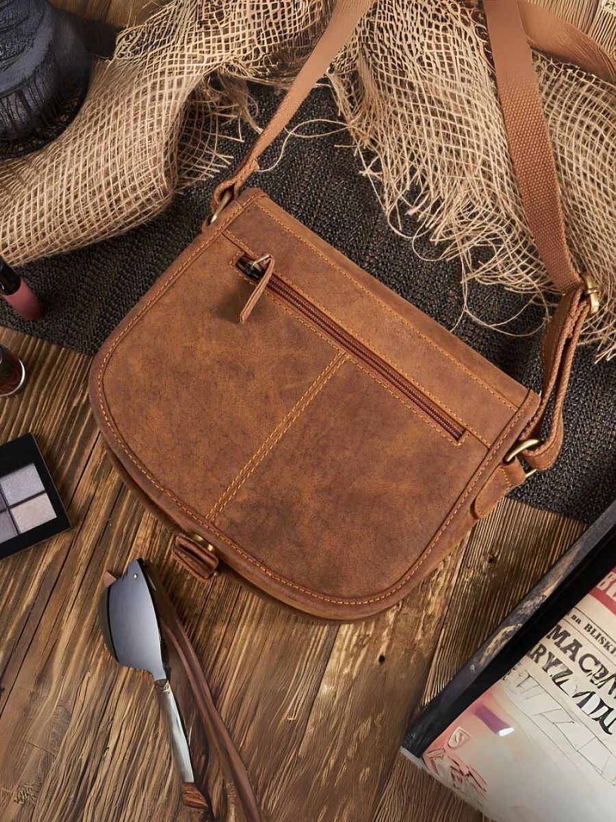 Model T-39-LB to mała i poręczna torebka damska wykonana ze skóry naturalnej w stylu vintage. Ta klasyczna propozycja dodatku galanteryjnego świetnie sprawdzi się zarówno w zimowych, jak i również wiosenno-letnich stylizacjach. Torebka jest zapinana skórzanym paskiem na magnes, zakończonym ozdobną metalową sprzączką w kolorze przecieranego złota. Pod klapą umieszczono mniejszą kieszeń wsuwkę. Główna komora, wykończona połyskującą podszewką, posiada kieszeń na suwak oraz przegródkę na telefon. Na tyle torebki znajduje się kolejna kieszeń na suwak. Solidny skórzany pasek o długości 140 cm, na ramię z regulacją, dodatkowo wzmocniony bawełnianą taśmą nośną pozwala na wygodne noszenie torebki w każdej codziennej sytuacji.