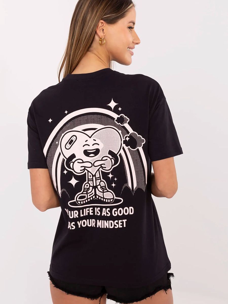 Damski T-shirt w stylu casual to uniwersalna propozycja na co dzień. Wykonany z wysokiej jakości bawełny, zapewnia komfort i swobodę ruchów przez cały dzień. Model o standardowej długości, z klasycznym okrągłym dekoltem i krótkimi rękawami. Z przodu subtelny, niewielki nadruk dodaje delikatnego akcentu, natomiast tył przyciąga wzrok wyrazistym nadrukiem z napisami. Idealny do jeansów, szortów czy spódnicy, świetnie sprawdzi się w miejskich, luźnych stylizacjach.